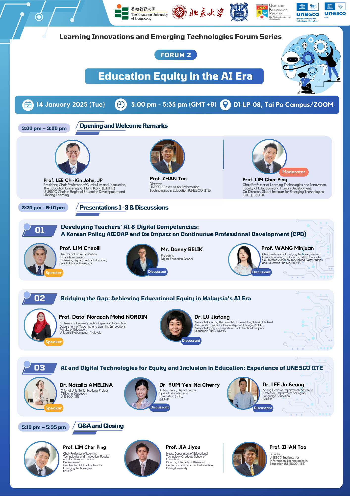 該論壇系列由本團隊聯同聯合國教科文組織教育信息技術研究所(UNESCO Institute for Information Technologies in Education, UNESCO IITE)及聯合國教科文組織教席計劃(UNESCO Chairs Programme)合作舉辦,旨在促進教育持份者之間的交流與對話,並為教育界建立一個協作網絡,推動有深度、有意義的教育發展。